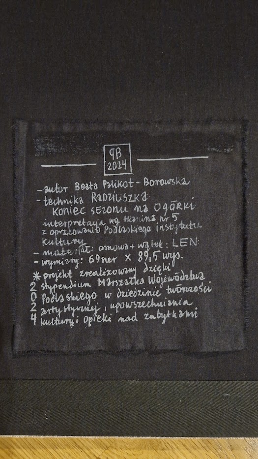 Do powstania obiektu Koniec sezonu na Ogórki zostały wykorzystane 2 sekwencje deptania z wzoru głównego/spisku – tkanina nr 5/W Ogórki, będący jego interpretacją.
