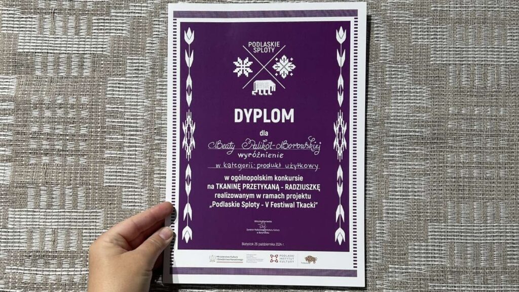 obie tkaniny zostały wyróżnione w Ogólnopolskim Konkursie na Tkaninę Przetykaną, II kategoria – produkt użytkowy inspirowany Tkaniną Przetykaną, Podlaski Instytut Kultury w Białymstoku, X 2024 r. *link na końcu posta