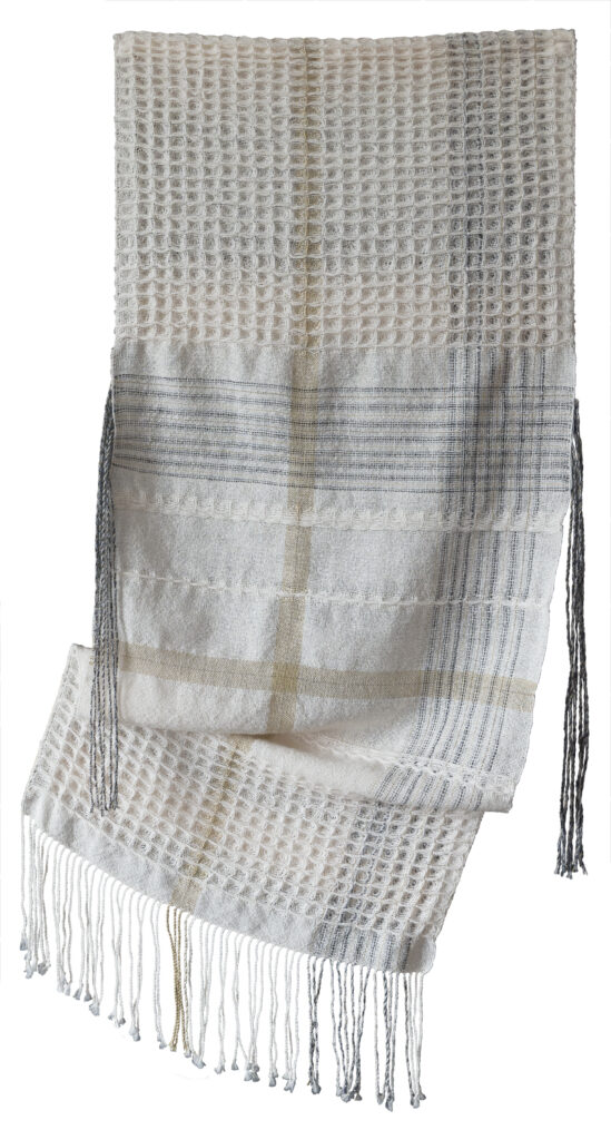 technika: tkanina wielonicielnicowa – wafel, z frędzlami, umieszczona na drewnianej ramie włożonej w dywan strzyżony