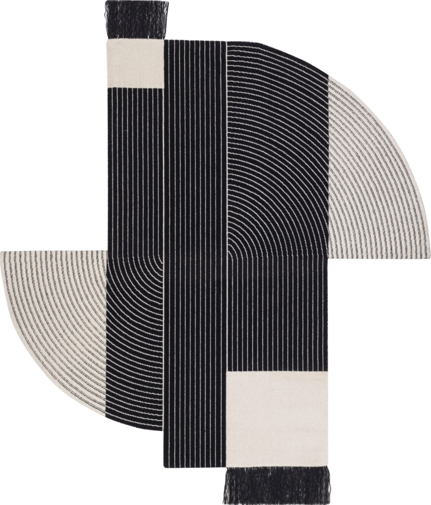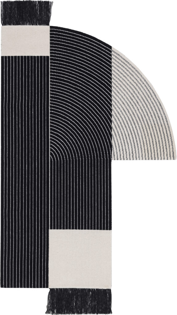 Po utkaniu wycięte i wykończone ręcznie w technice bindingu, czyli poprzez obszycie bawełnianą taśmą. Całość dopełniają długie frędzle, wytkane ręcznie na ramie tkackiej. Powstały 2 komplety prototypów.